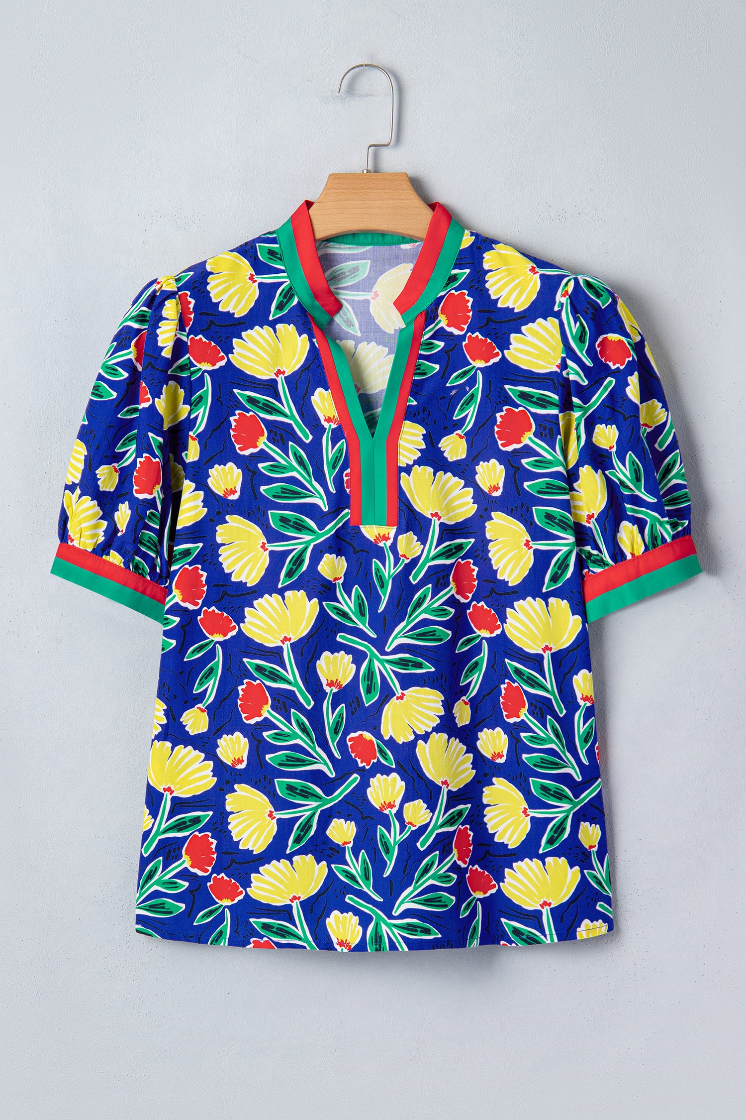 Blue Wild Floral Printed Contrast Striped Patchwork V Neck Short Sleeve Blouse